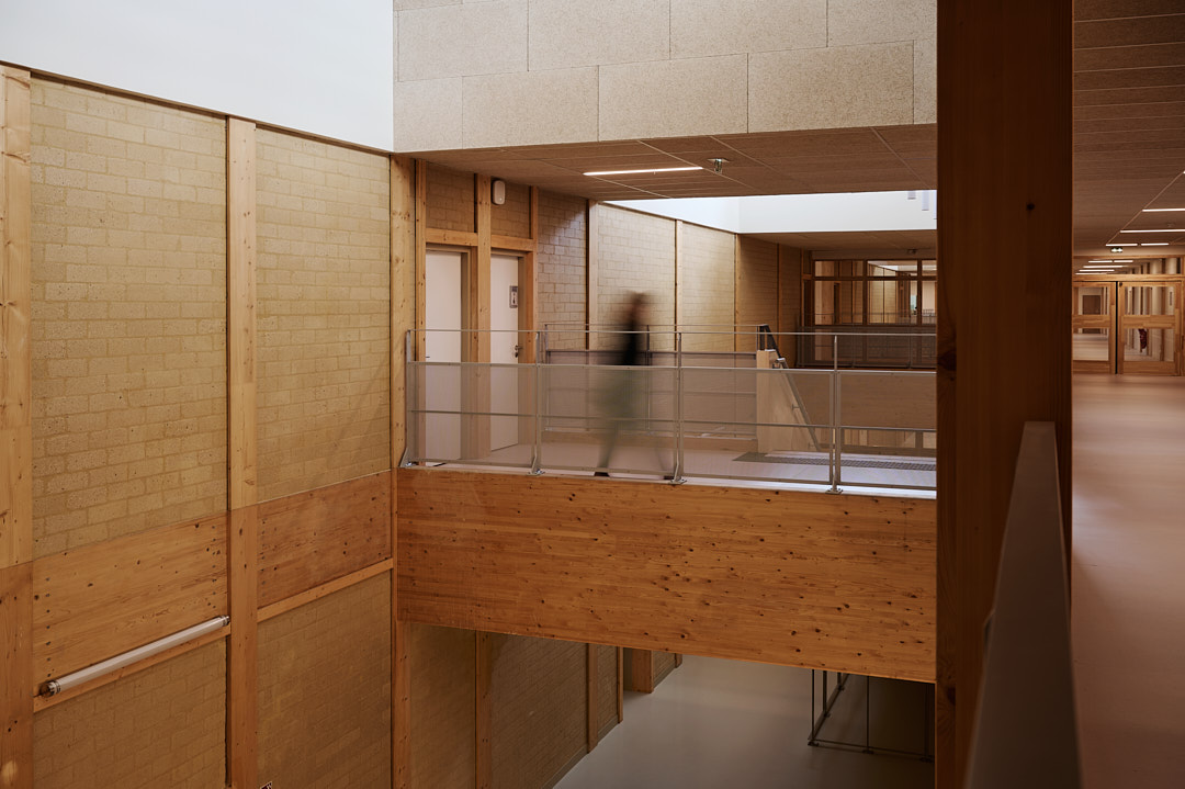Le chantier, d’une surface d’environ 600 m², a intégré des cloisons en BTC Flexiterre (30 × 20 × 10 cm) non stabilisées, utilisées en séparatif de circulation et de classes. Ponçées en fin de chantier pour un rendu plus rugueux, elles apportent une esthétique brute et contemporaine, tout en améliorant le confort thermique et hygrométrique. Véritables accumulateurs, ces briques régulent la température et l’humidité, garantissant un confort optimal en hiver comme en été.